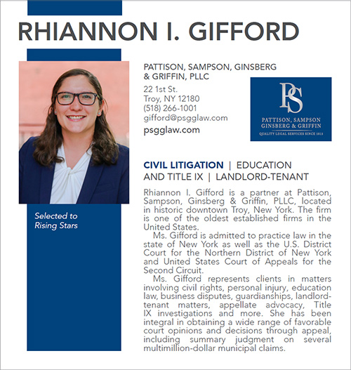 Pattison, Sampson, Ginsberg & Griffin, PLLC is proud to announce that Rhiannon I. Gifford has been recognized as a Rising Star by the 2024 Upstate New York Super Lawyers!